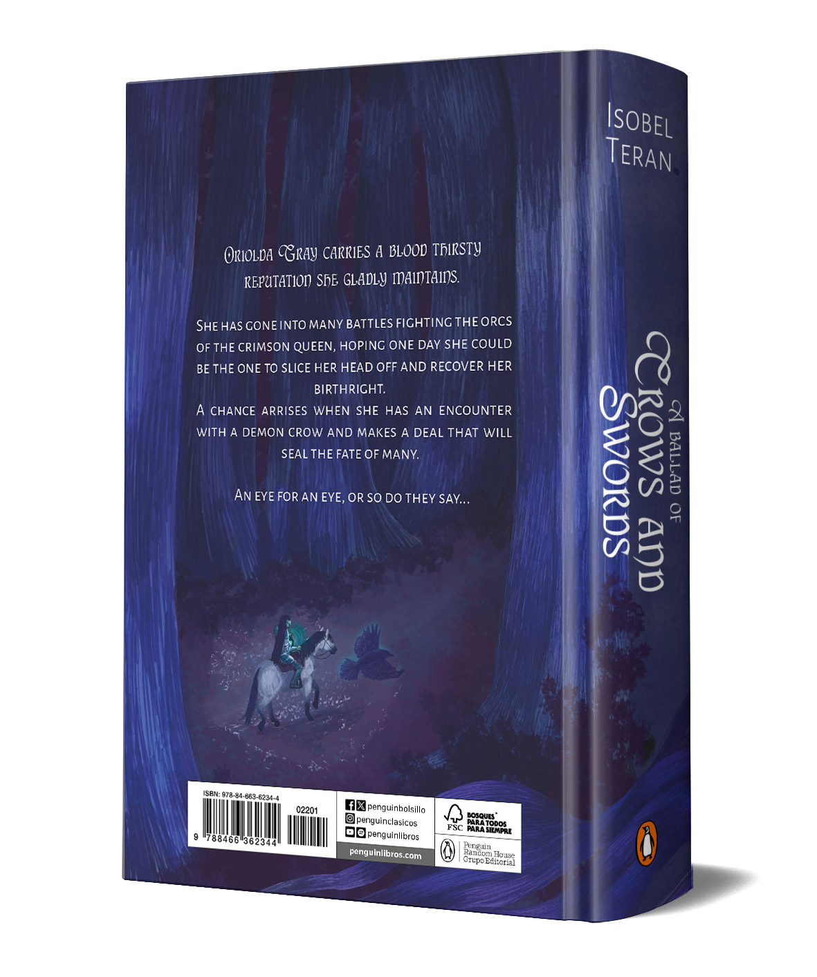 - Dust jacket illustration with the female lead, integrated with the spine and the back cover illustration of a dark forest scene with the heroine on horseback with a crow.