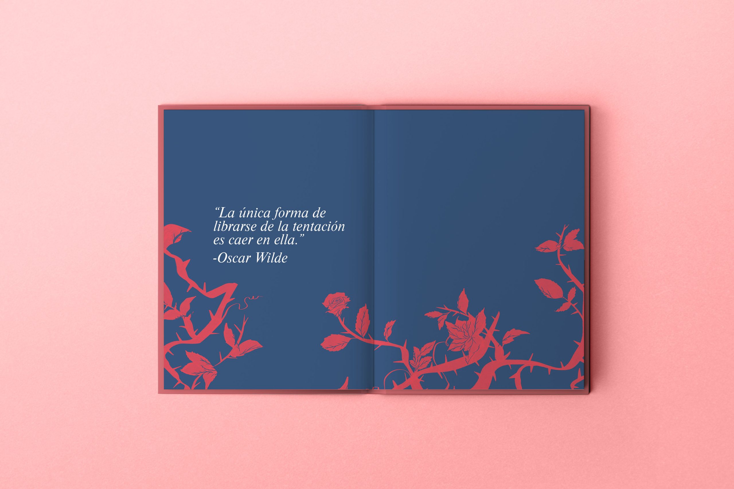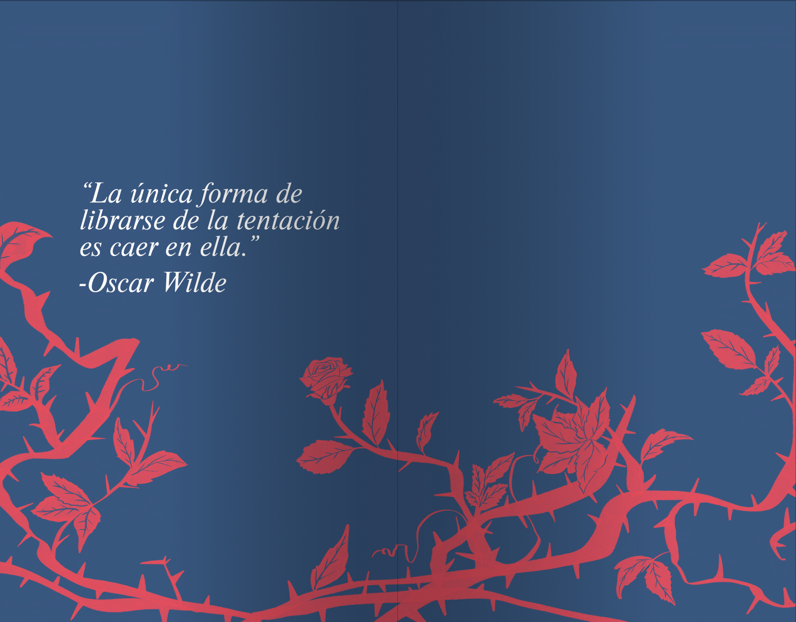 - Illustrated endpapers, floral motif and a quote from the book: “La única forma de librarse de la tentación es caer en ella.”