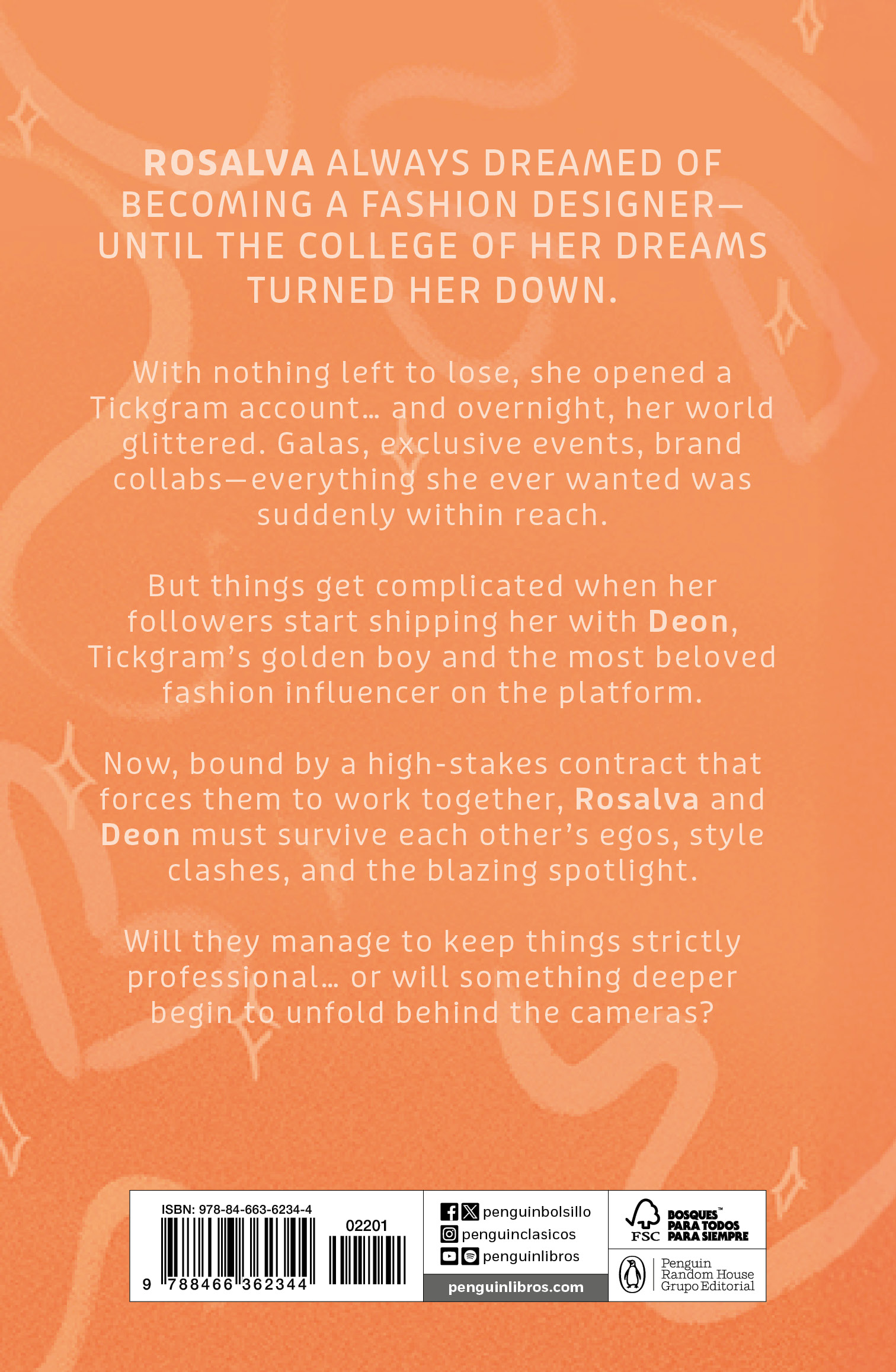- Hard cover illustration of the main characters: “Rosalva” (latin young woman), and “Deon” (african-american man). Both with maximalism outfit elements, contrasting color palette. Ages between 25-30, Rosalva has pitch black hair, a mole on her upper left side of the mouth, uses many accesories. Deon has dark brown hair and uses rings. Characters must be interacting with each other, cheesy or funny poses that represent the “enemies to lovers” trope.